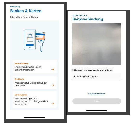 Wählen Sie den Button „Bankverbindung für Online Banking freischalten“ und scannen Sie anschließend den Aktivierungscode im Anschreiben oder geben Sie ihn manuell ein.