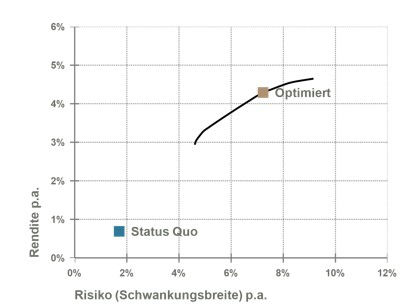 Die Rendite-/Risiko-Kennzahlen der aktuellen Vermögenszusammensetzung liegen unterhalb der Effizienzlinie. Durch eine Anpassung Ihrer Vermögensstruktur werden wir die erwartete Rendite voraussichtlich steigern können, wobei das Risiko sogar deutlich zurückgeht.